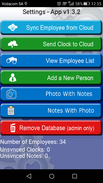 Set up the app as described in the manual. You can then sync employees, upload clockings, view current employees on the database and add new employees.